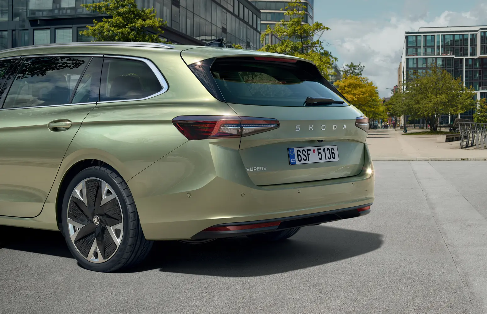 Superb Combi působí sebevědomým a elegantním dojmem, na čemž má zásluhu mimo jiné skulpturálně tvarovaná kapota nebo tenké přední světlomety. Na přídi vozu naleznete Matrix-LED přední světlomety druhé generace a zádi dominují Top LED zadní světla výrazně protažená do pátých dveří. Pro Superb Combi jsou k dispozici výhradně kola z lehké slitiny, a to ve velikostech od 17“ do 19“.