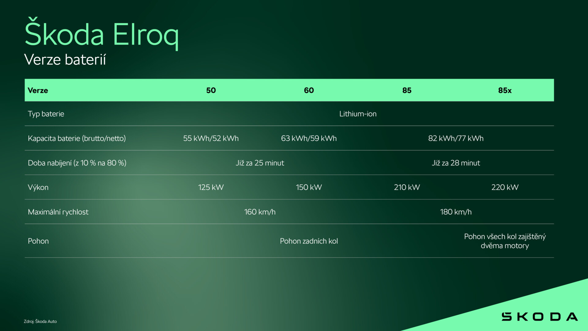 Zcela nový model Škoda Elroq postavený na modulární platformě pro elektromobily MEB koncernu Volkswagen bude nabízen ve čtyřech variantách pohonu: Elroq 50, 60, 85 a 85x. Tyto modely se liší kapacitou baterie a výkonem, který se pohybuje od 125 kW do 220 kW. Základní model Elroq 50 s pohonem zadních kol je vybaven baterií s brutto kapacitou 55 kWh a elektromotorem na zadní nápravě, který vyvíjí maximální výkon 125 kW. Elroq 60 má baterii o kapacitě 63 kWh a elektromotor o výkonu 150 kW. Oba tyto modely dosahují maximální rychlosti 160 km/h. Modely Elroq 85 a Elroq 85x jsou vybaveny baterií s brutto kapacitou 82 kWh. Elroq 85 s pohonem zadních kol má maximální výkon 210 kW. Elroq 85x má druhý elektromotor umístěný na přední nápravě, nabízí standardně pohon všech kol a maximální výkon 220 kW. Obě verze, Elroq 85 i Elroq 85x, dosahují maximální rychlosti 180 km/h a mají elektrický dojezd až 560 km.