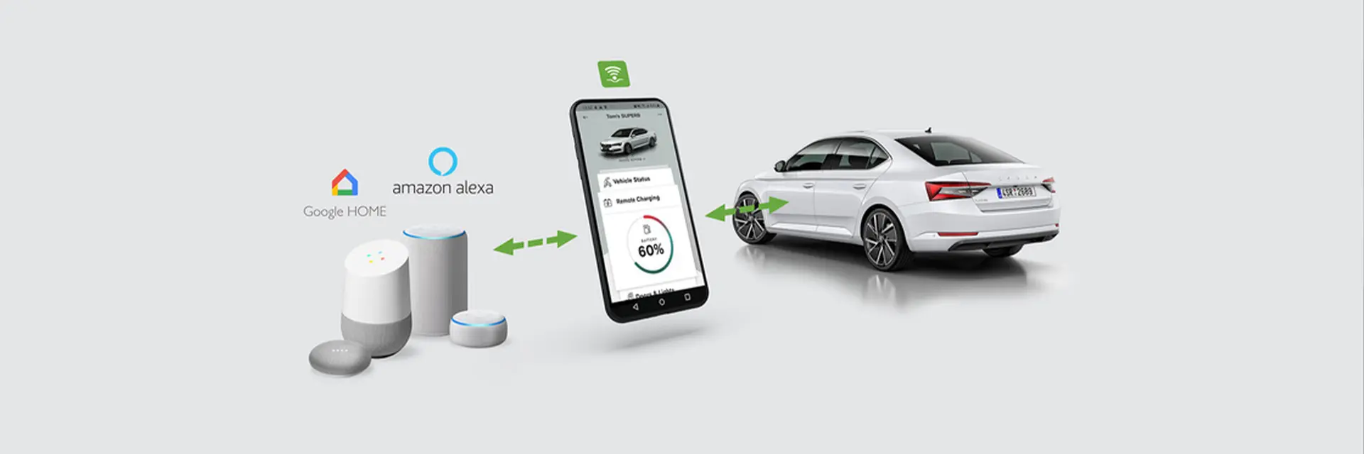 Alexa, je hlasový asistent vyvinutý společností Amazon. Poprvé se objevil na Amazon Echo a nyní je k dispozici na mnoha dalších chytrých zařízeních. Můžete jí říci jedním slovem – „Alexa“. Pak se jednoduše zeptejte na svůj vůz Škoda. Snadno mějte přehled o aktuálním počtu najetých kilometrů, hladině paliva, dojezdu, zda je vozidlo uzamčeno, kde je zaparkováno, nebo jednoduše spusťte klimatizaci nebo dobijte baterii ve vozidle.